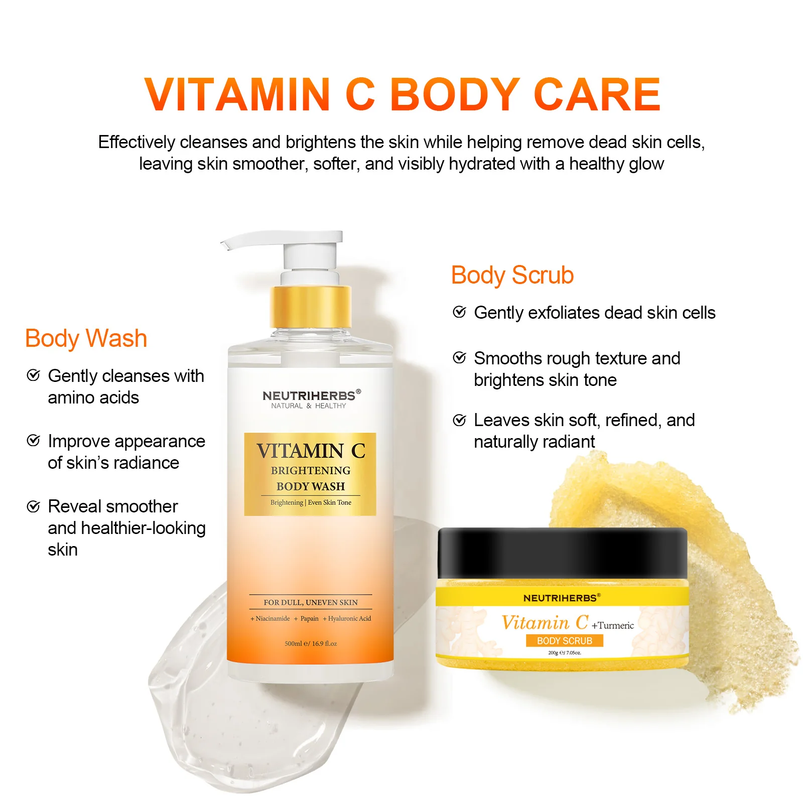 Neutriherbs Vitamin C Brightening Body wash with its rich lather, infuses your skin with skin care ingredients, leaving skin feeling soft and silky to the touch. And it easily rinses off clean without leaving an oily, coated feel. Supercharged with Vitamin C and Niacinamide to help give your skin a radiant glow while helping banish dullness and reveal softer, smoother, and healthier-looking skin. Developed for all skin types, and gentle enough for daily use.