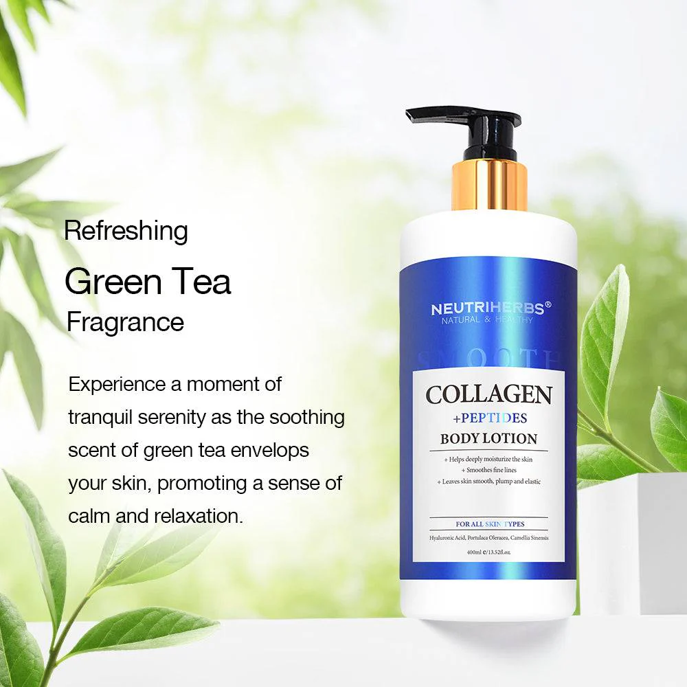 Collagen Body Lotion with Collagen, Peptides, and Hyaluronic Acid. Naturally rich in Amino Acids and Peptides, collagen provides nutrients to the skin for an optimally healthy-looking, hydrated look. Enhanced with Peptides and Hyaluronic Acid, these beneficial ingredients contain restorative properties, and increase the water retention in your skin to reduce the appearance of wrinkles and fine lines for a flawless complexion.