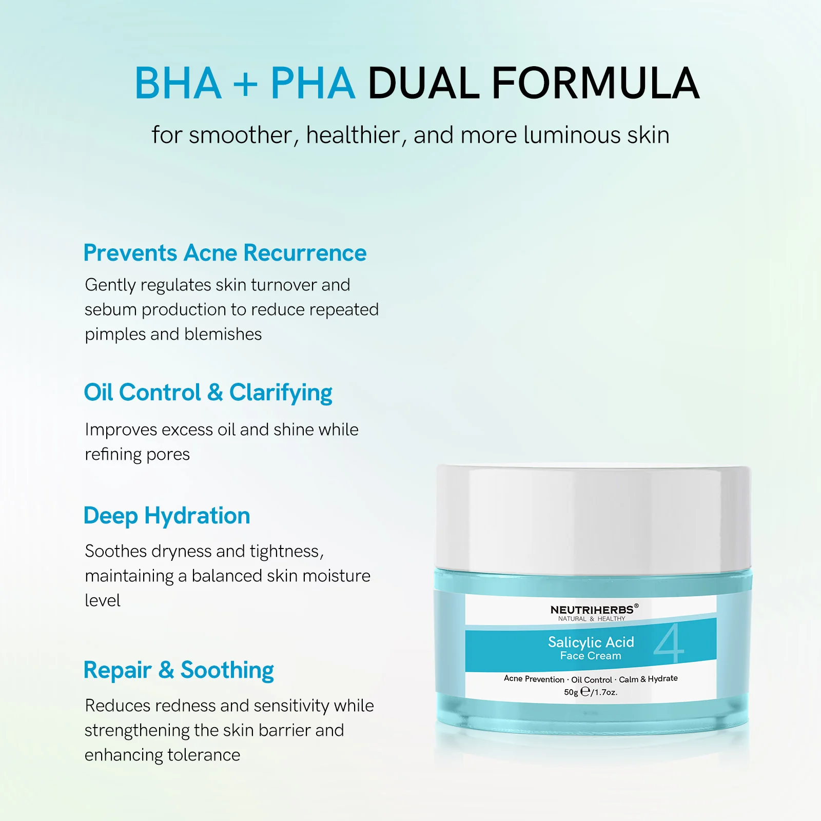 Neutriherbs Salicylic Acid Face Cream features a lightweight, gentle formula infused with Salicylic Acid, Niacinamide, and Centella Asiatica to help prevent acne recurrence. It effectively controls excess oil, refines pores, and minimizes shine, while providing deep hydration and soothing relief from dryness, tightness, and redness. Leaves skin clear, balanced, and comfortable — ideal for oily and acne-prone skin.