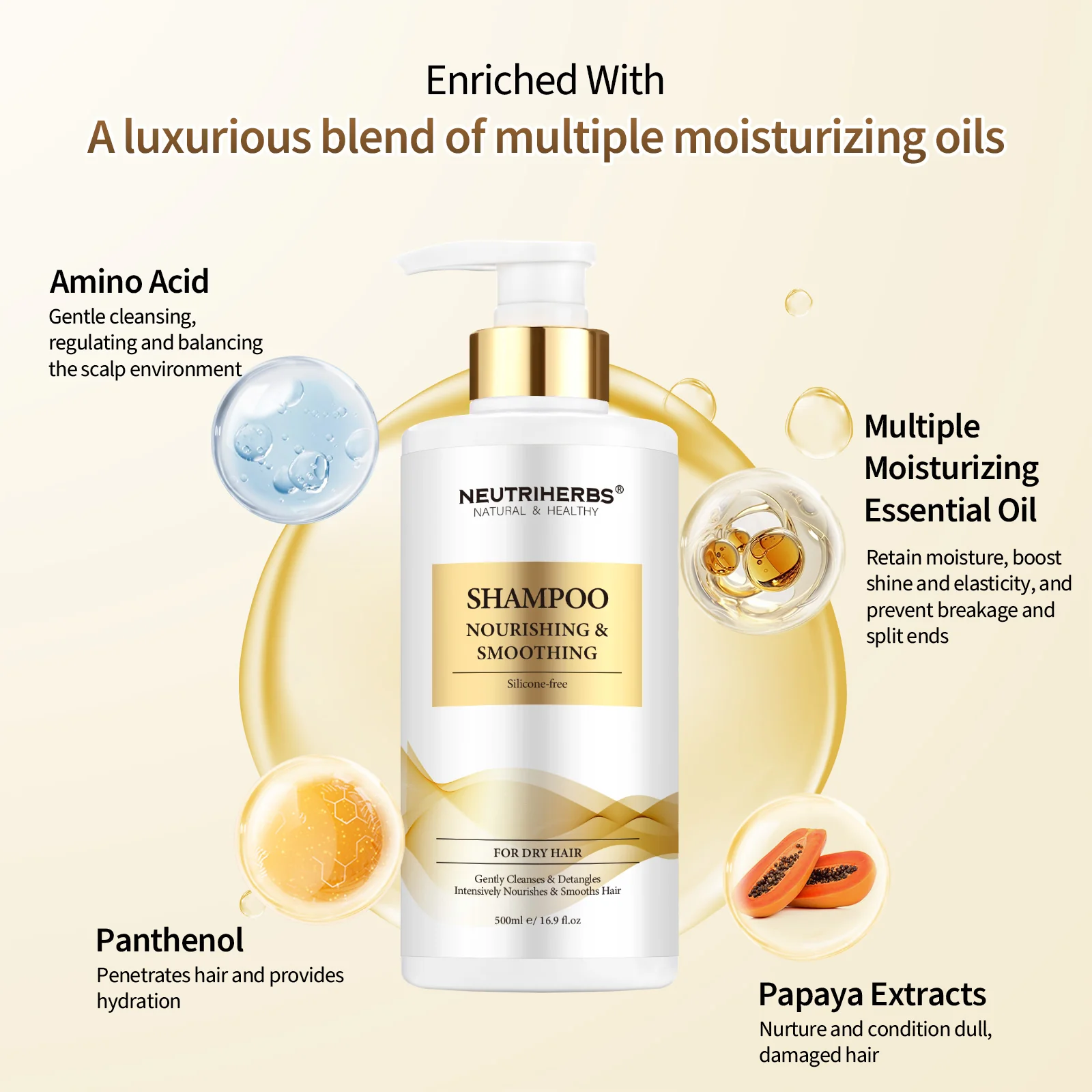 Neutriherbs Nourishing & Smoothing Shampoo is a revitalizing moisturizing essential oil enriched Shampoo. This silicone-free shampoo is designed to provide intense hydration and deep nourishment while gently cleansing your scalp, removing excess oils, impurities, and buildup, and restoring natural oils to make your strands softer and more manageable.
