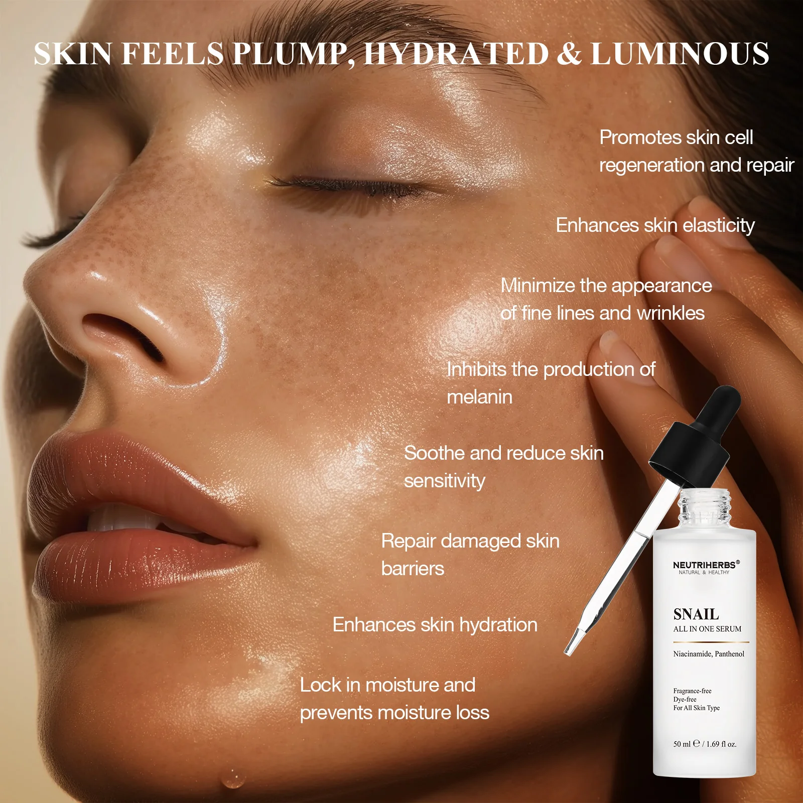 Neutriherbs Snail All-In-One Serum is infused with a nourishing blend of snail mucin to improve skin elasticity, resulting in a plump and youthful-looking finish. It is also enriched with Niacinamide and Panthenol to even out skin tone while maximizing moisture retention, keeping your skin moisturized and radiant all day.